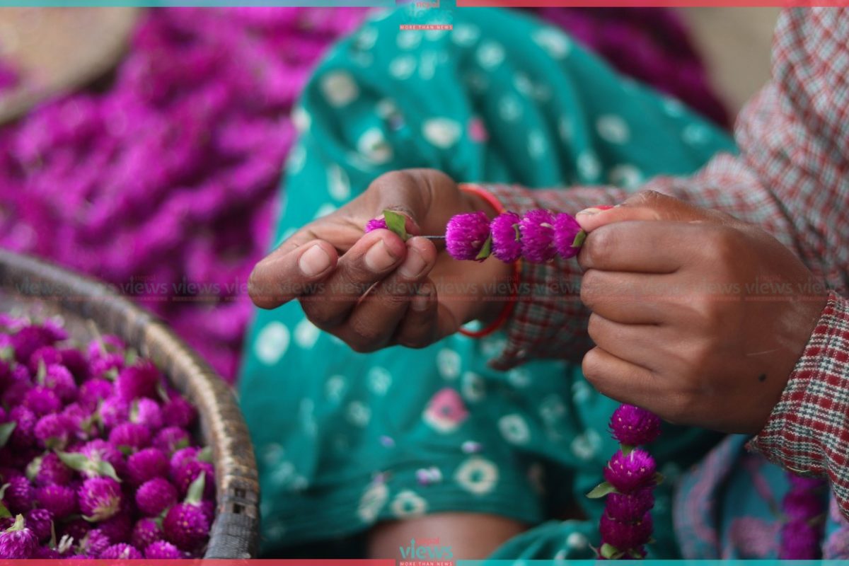 Farmers are busy plucking flowers every morning and weaving garlands in the afternoon. The garland of the Globe is taken as a symbol of long life. Sisters offer their Globe garland to their brothers praying for their long lives in Bhai Tika of Tihar.