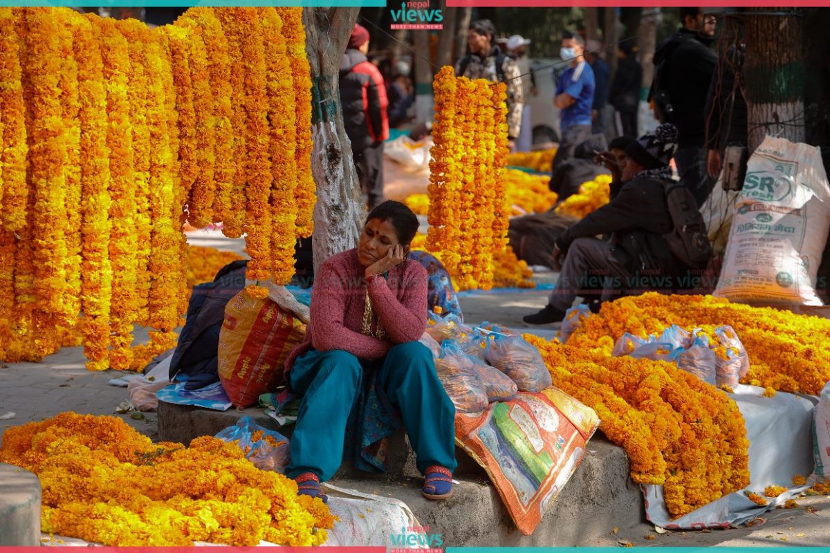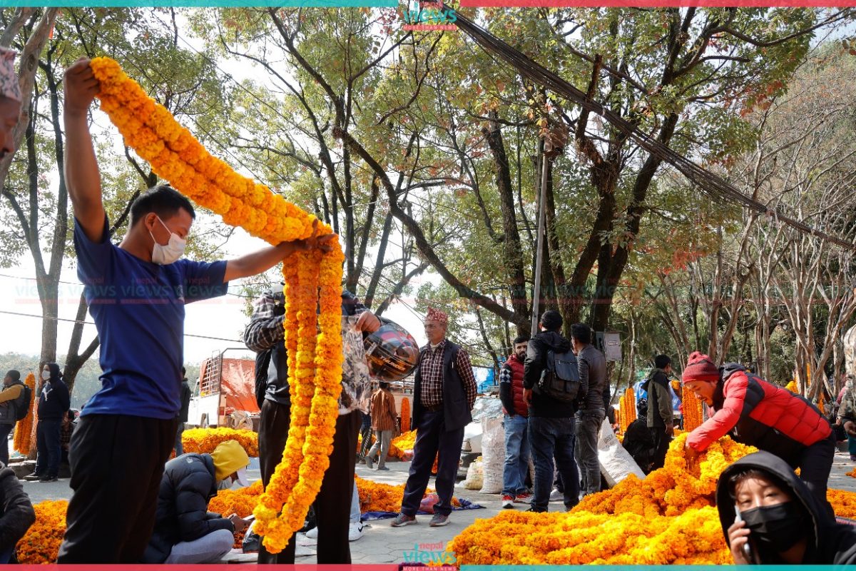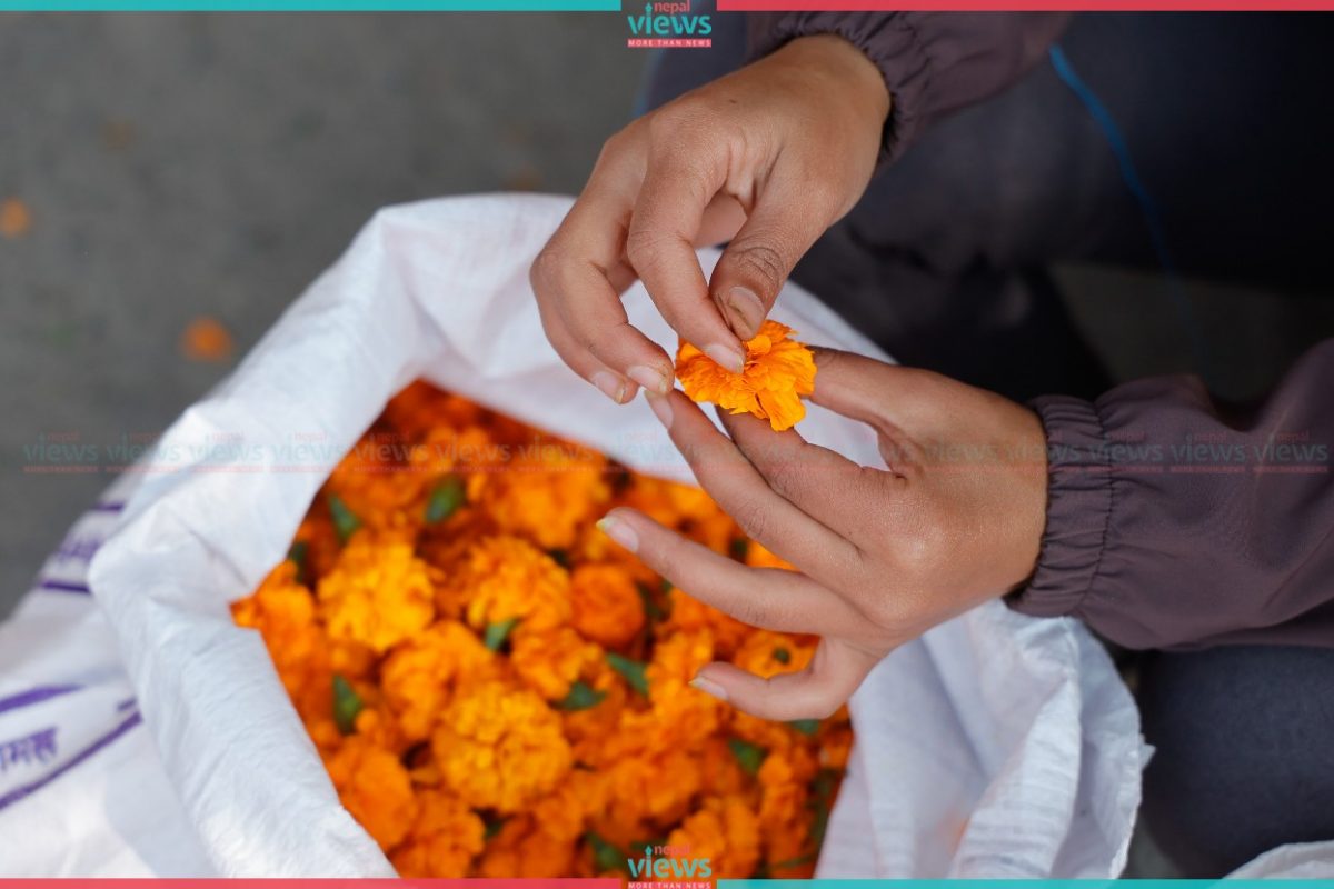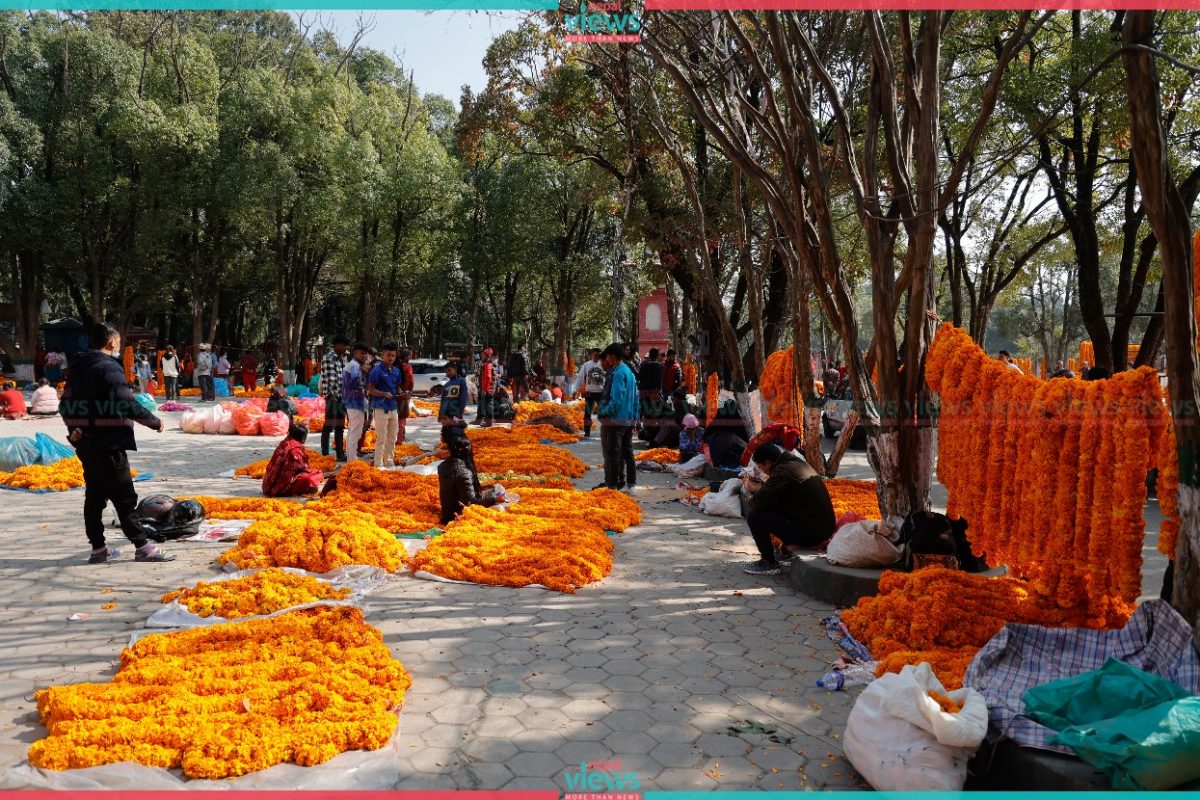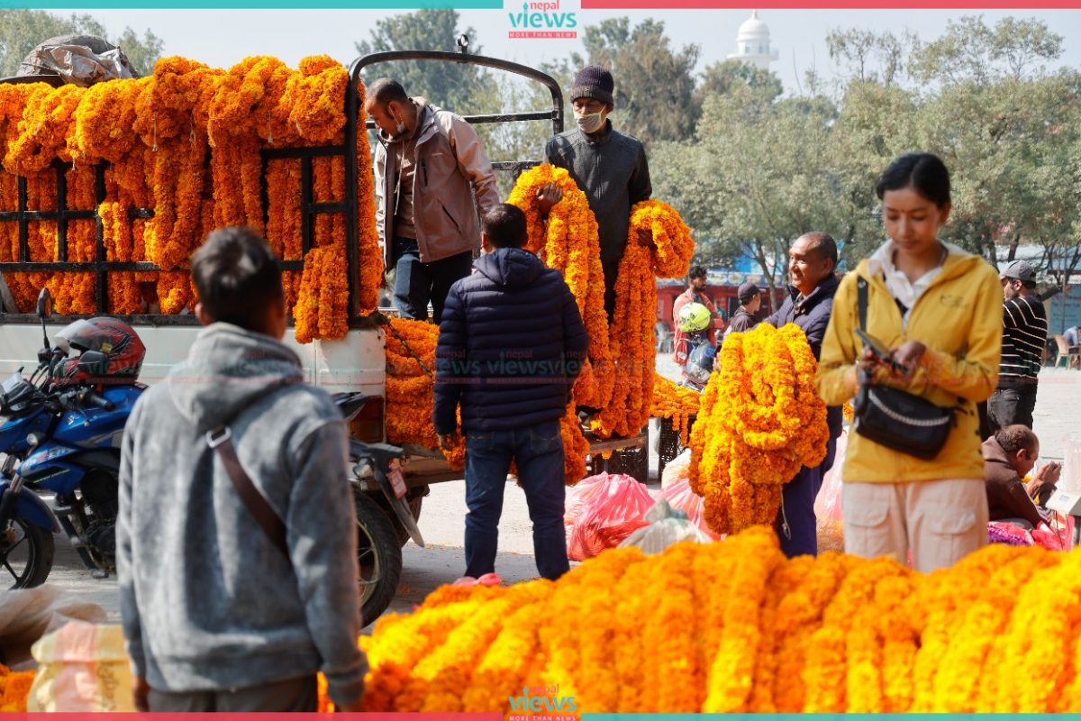 People are busy buying and selling Marigold flowers at Bhrikuti Mandap. Only the marigold grown in Nepal is being sold here.