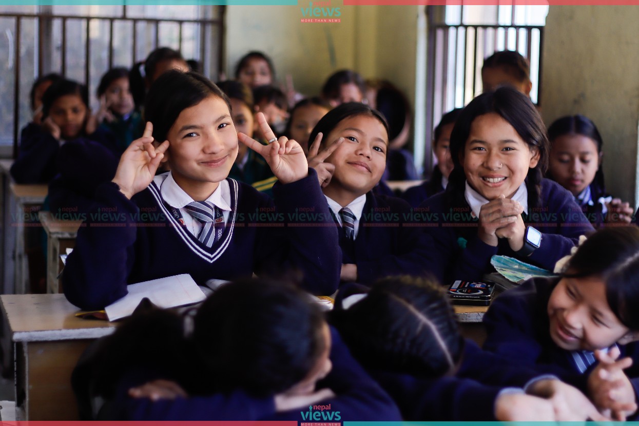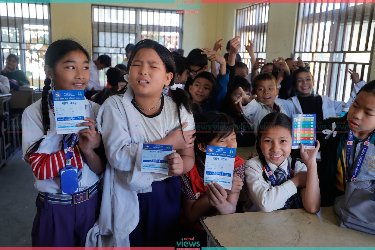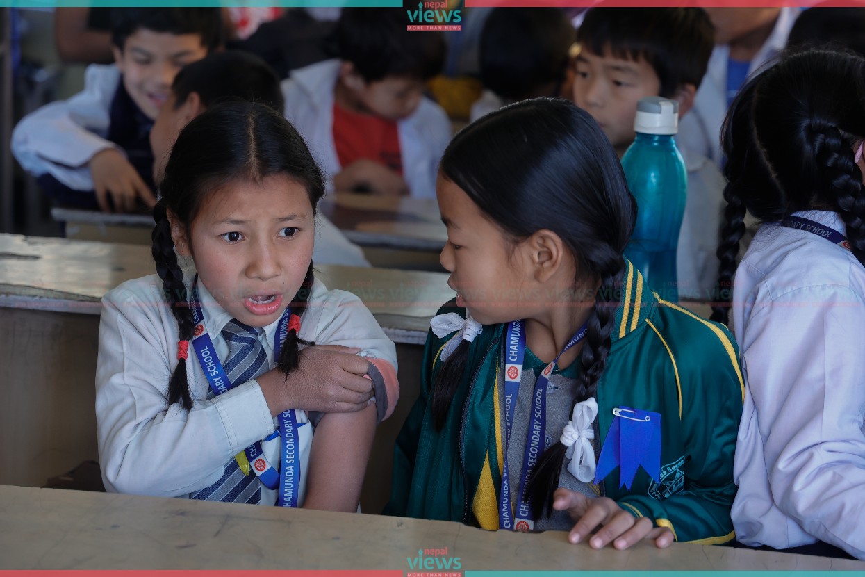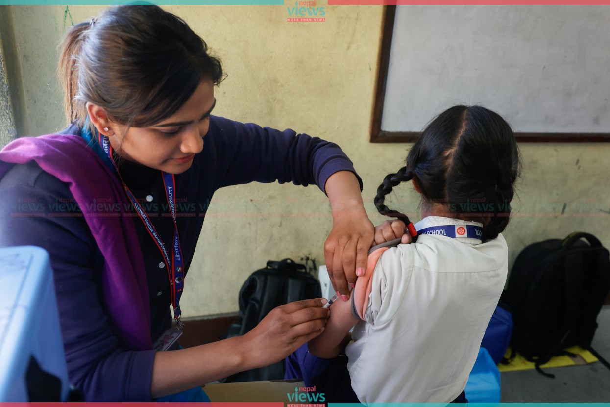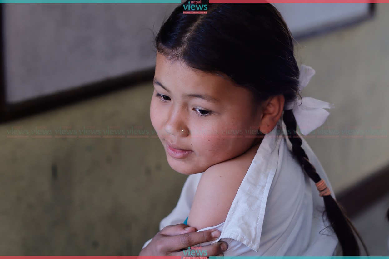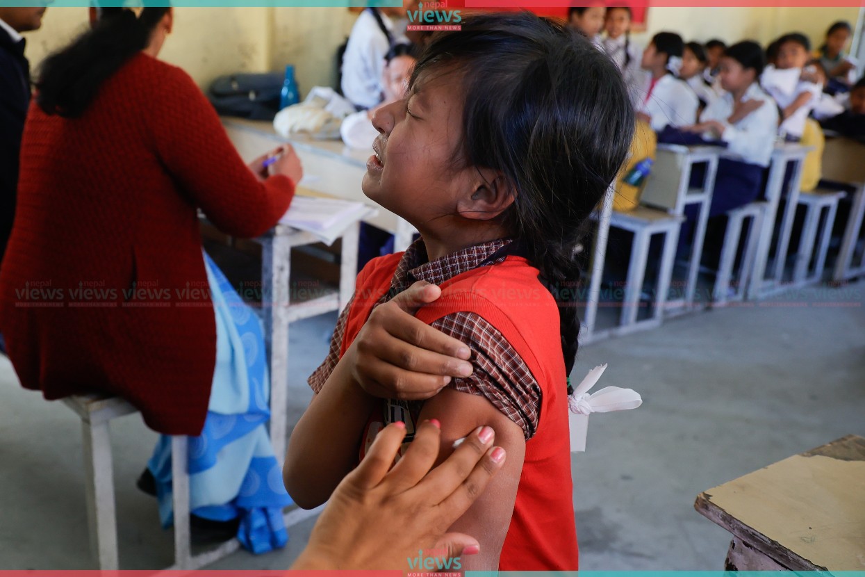 (Children getting measles-rubella vaccination in Chamunda Secondary School, Gokarneshwor Municipality)