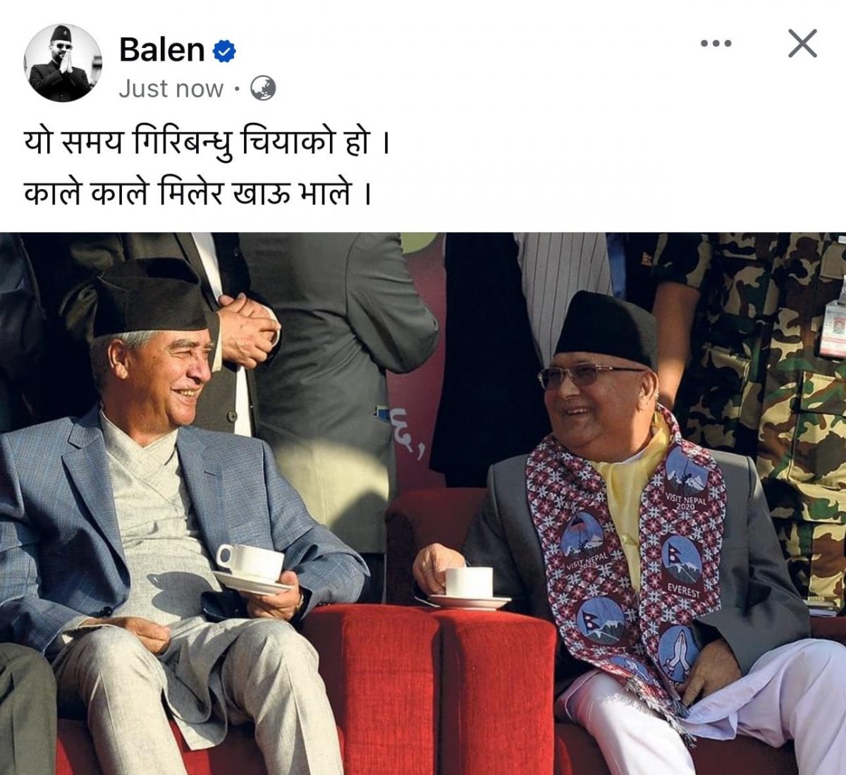 Mayor Shah analyzed the new power equation agreement between the Nepali Congress (NC) and CPN (UML). He posted an image of NC President Sher Bahadur Deuba and CPN (UML) Chairperson K.P. Sharma Oli having tea on social media platform.
