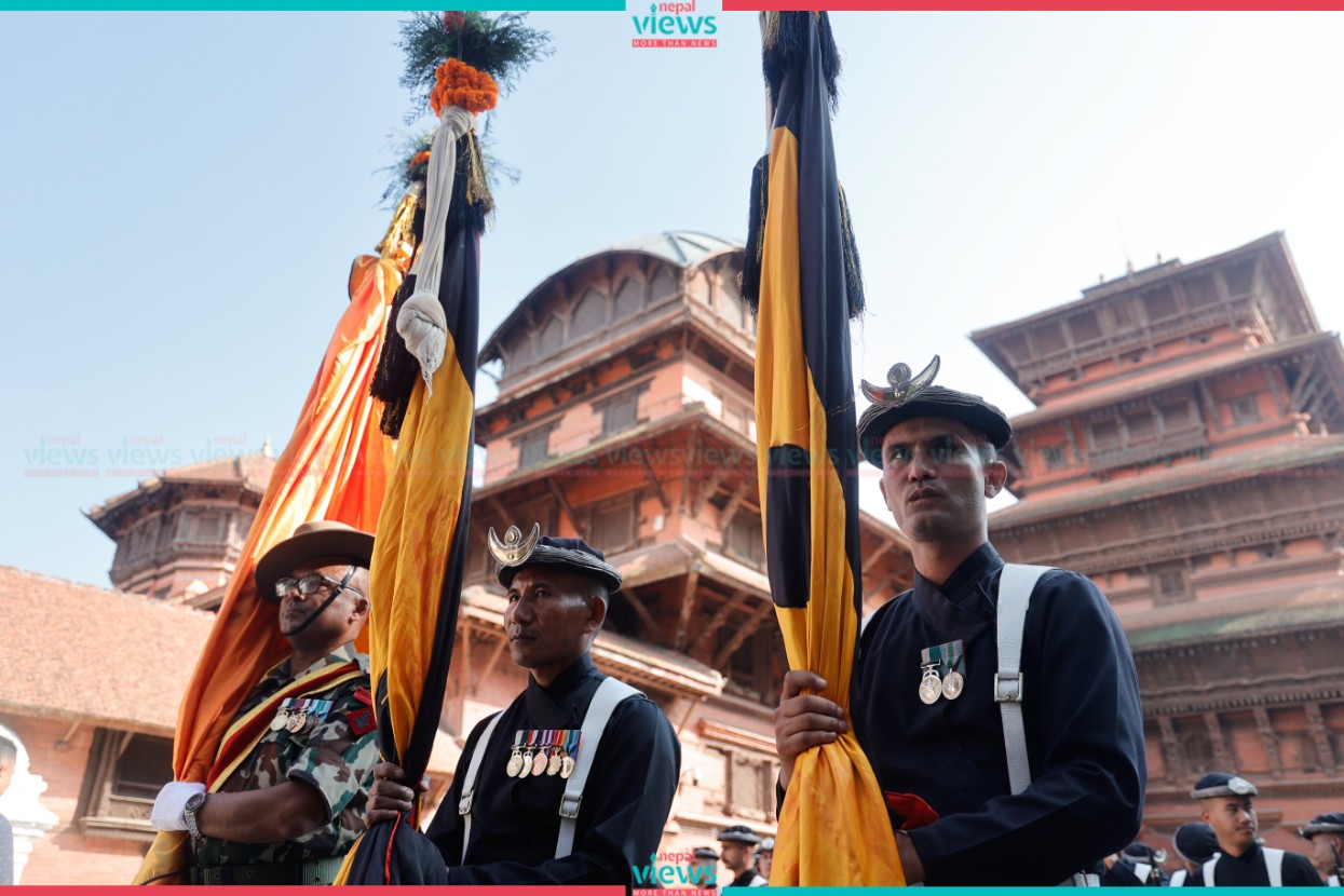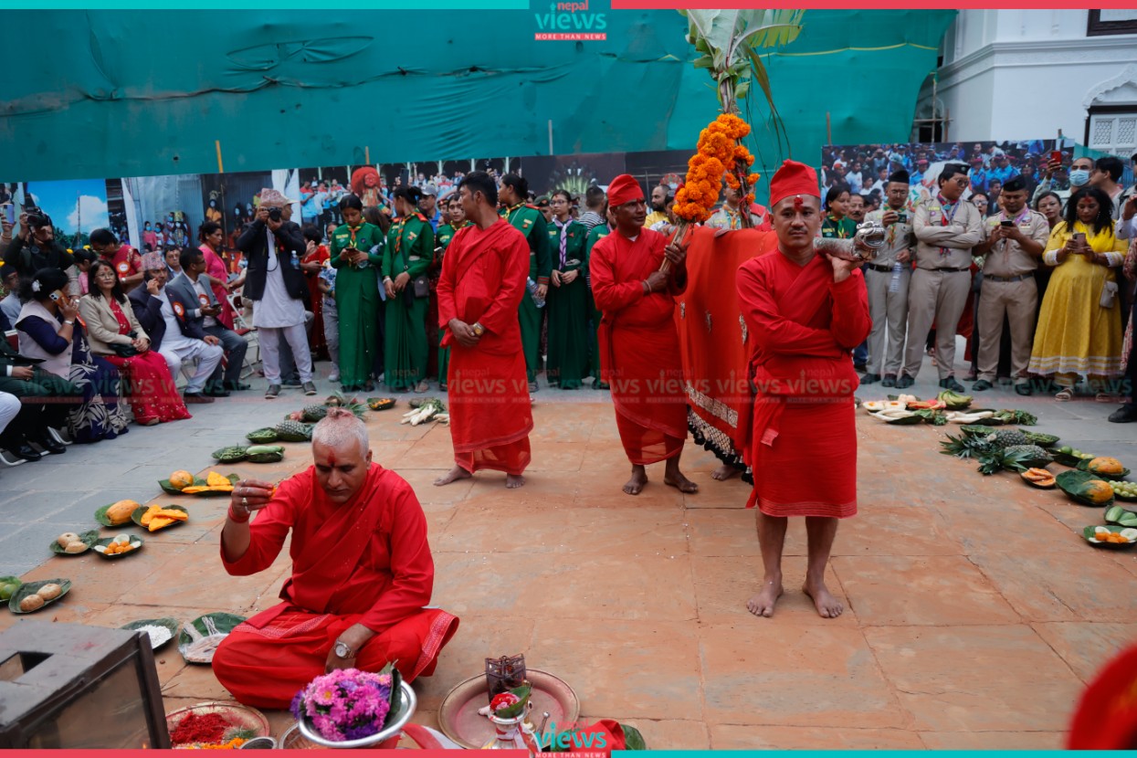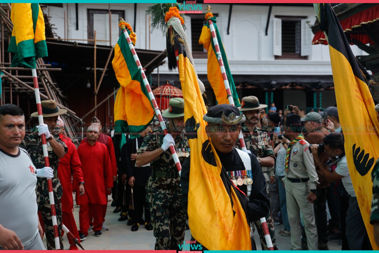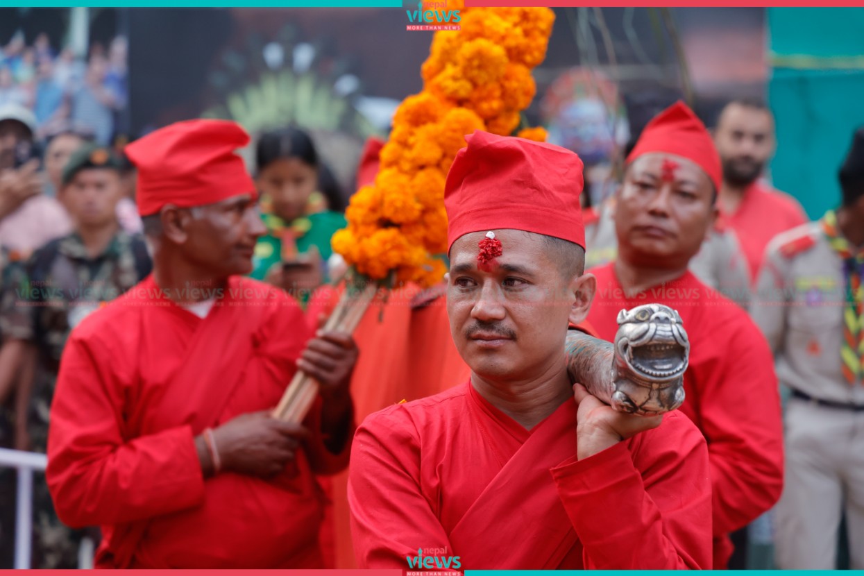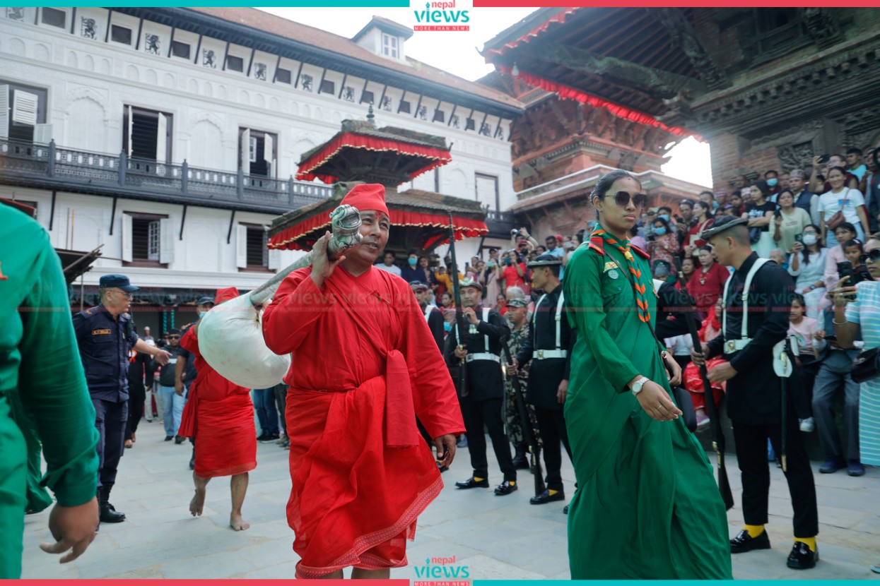 There is a ritual of high-ranking civil service offices, platoons of Guruju, musicians, and cultural dancers bringing the Fulpati from Jamal to Hanumandhoka with a huge celebration.