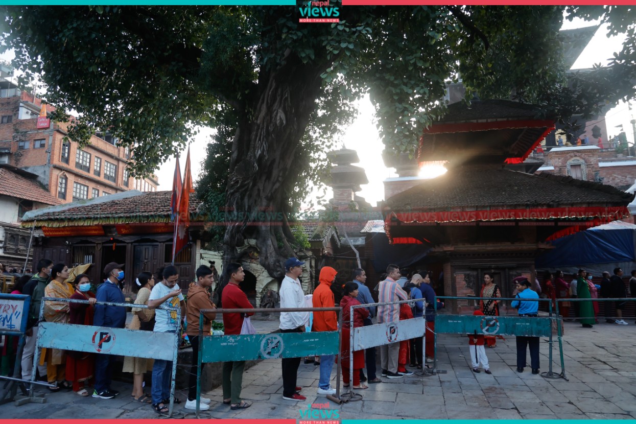 Devotees are lined up at the Temple on Friday morning. The temple, on Hanumandhoka Durbar premises, is open to the public only once a year i.e. on Mahanavami. Tulja Bhawani is worshipped as Sakshat Devi.
