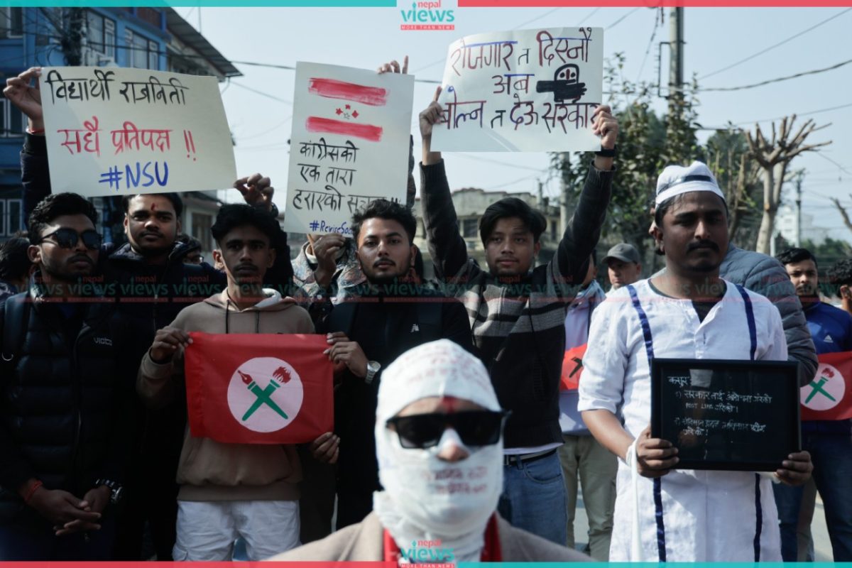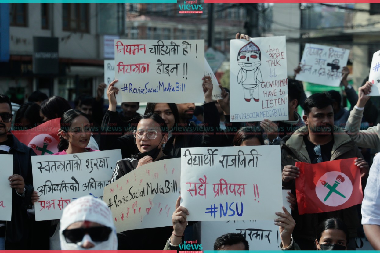 The Nepal Student Union (NSU), a wing of the Nepali Congress, demonstrated against the social media bill at Maitighar on Wednesday.