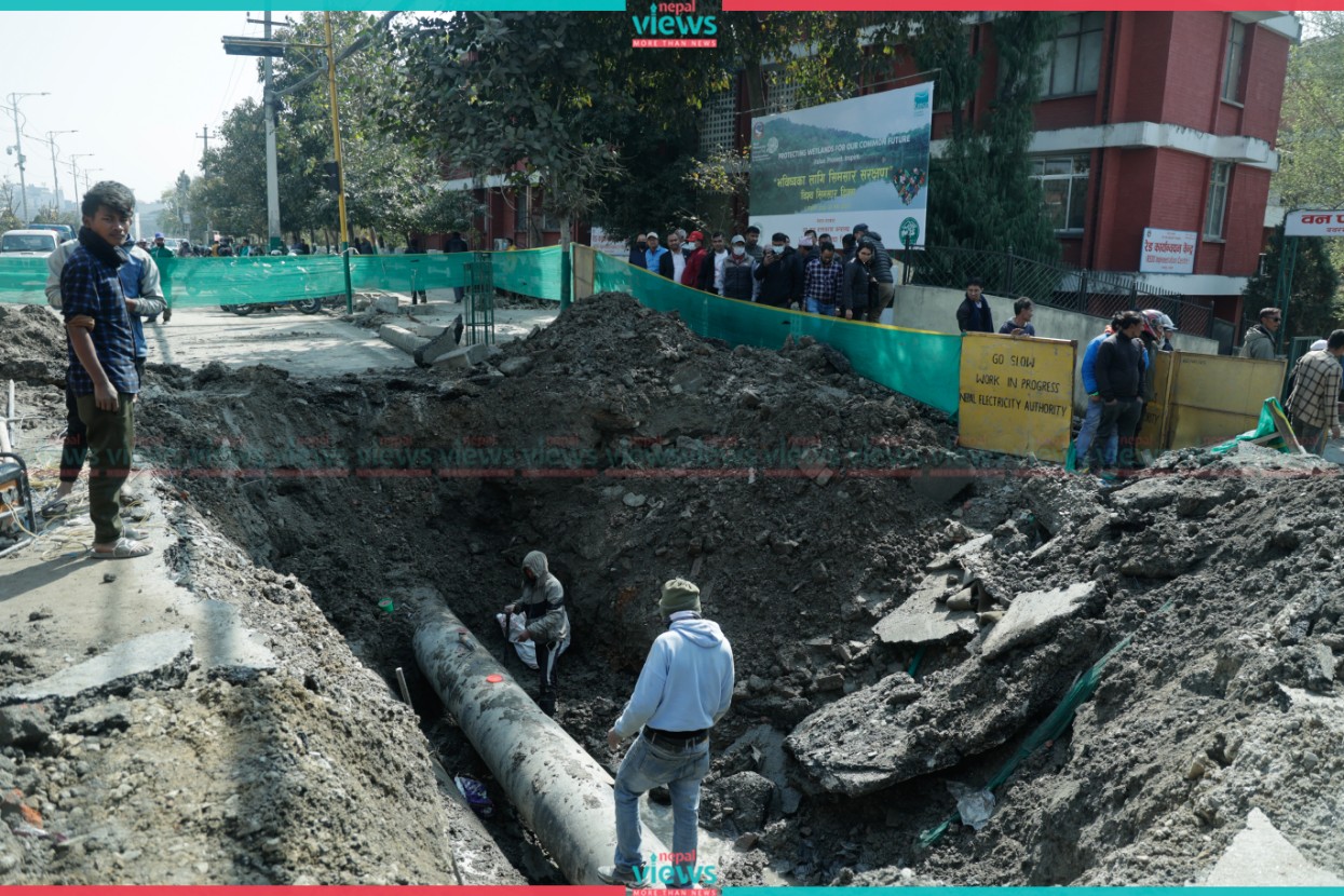 Along with repairing pipes, construction of damaged roads is underway in Babrmahal on Thursday. The pipe busted when a team from the Nepal Electricity Authority was drilling the road section for an underground supply of electricity.