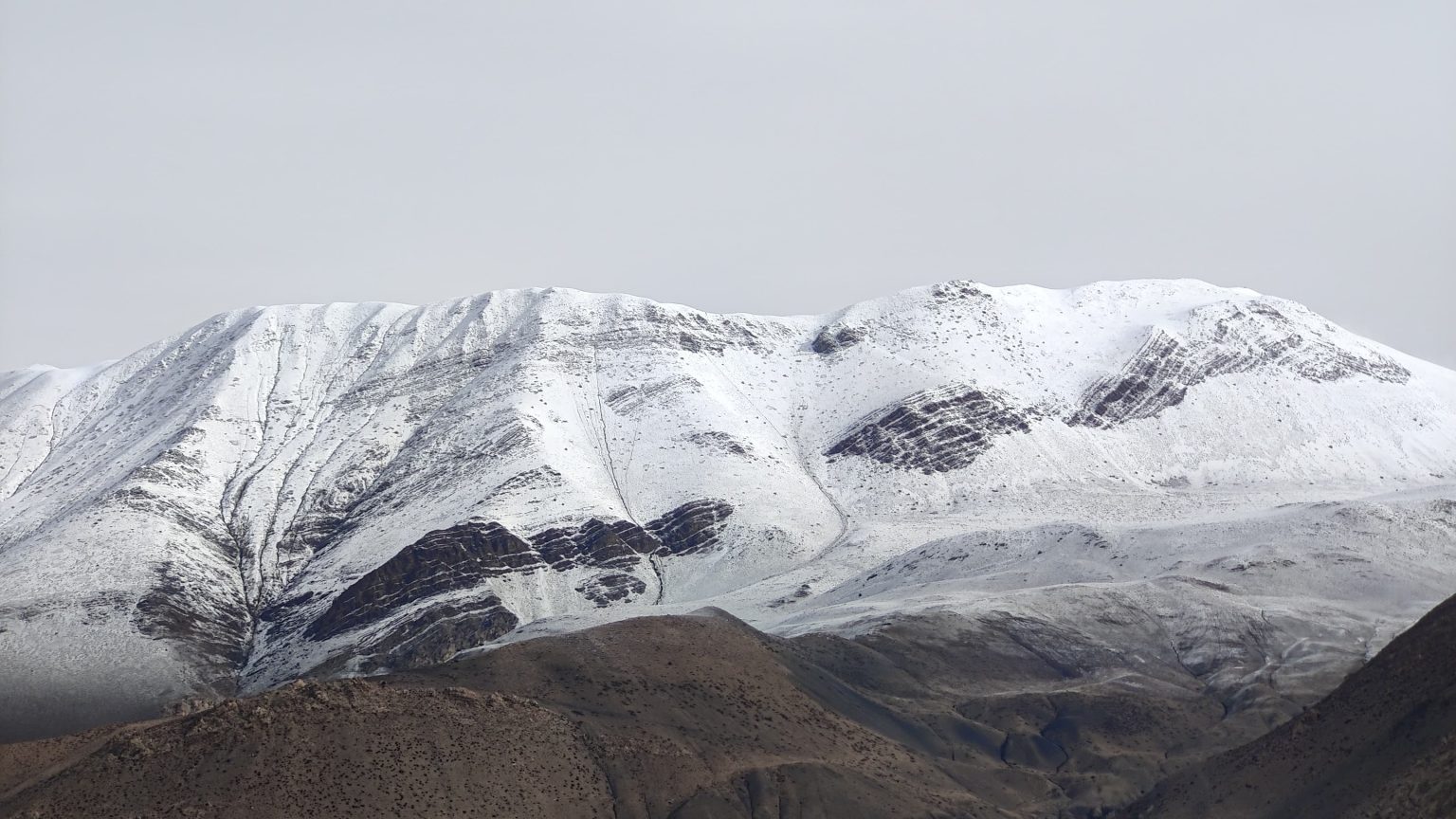 The slopes of Mustang covered with white, after snowfall. Roads are blocked in some places, due to snowfall.
