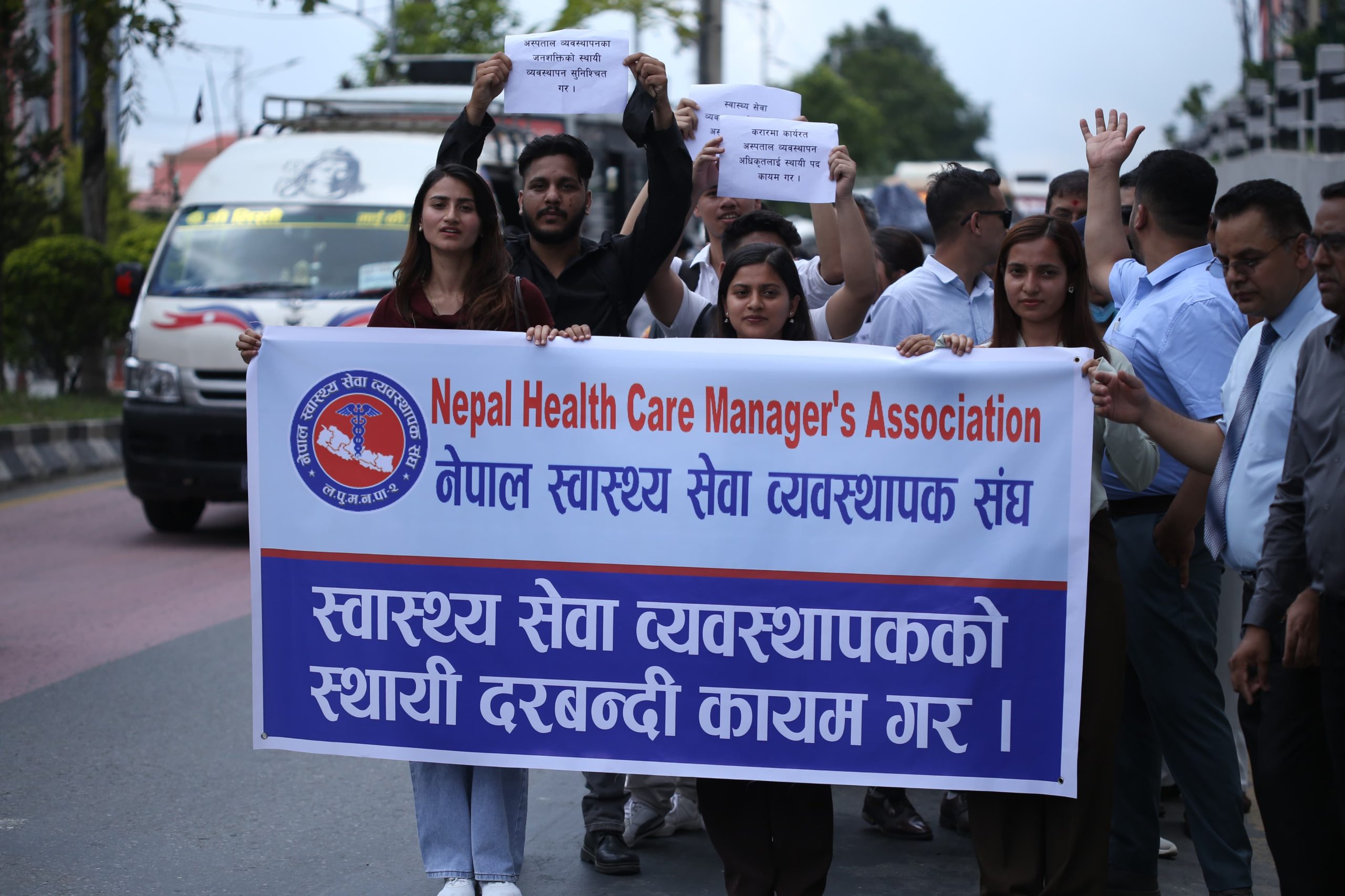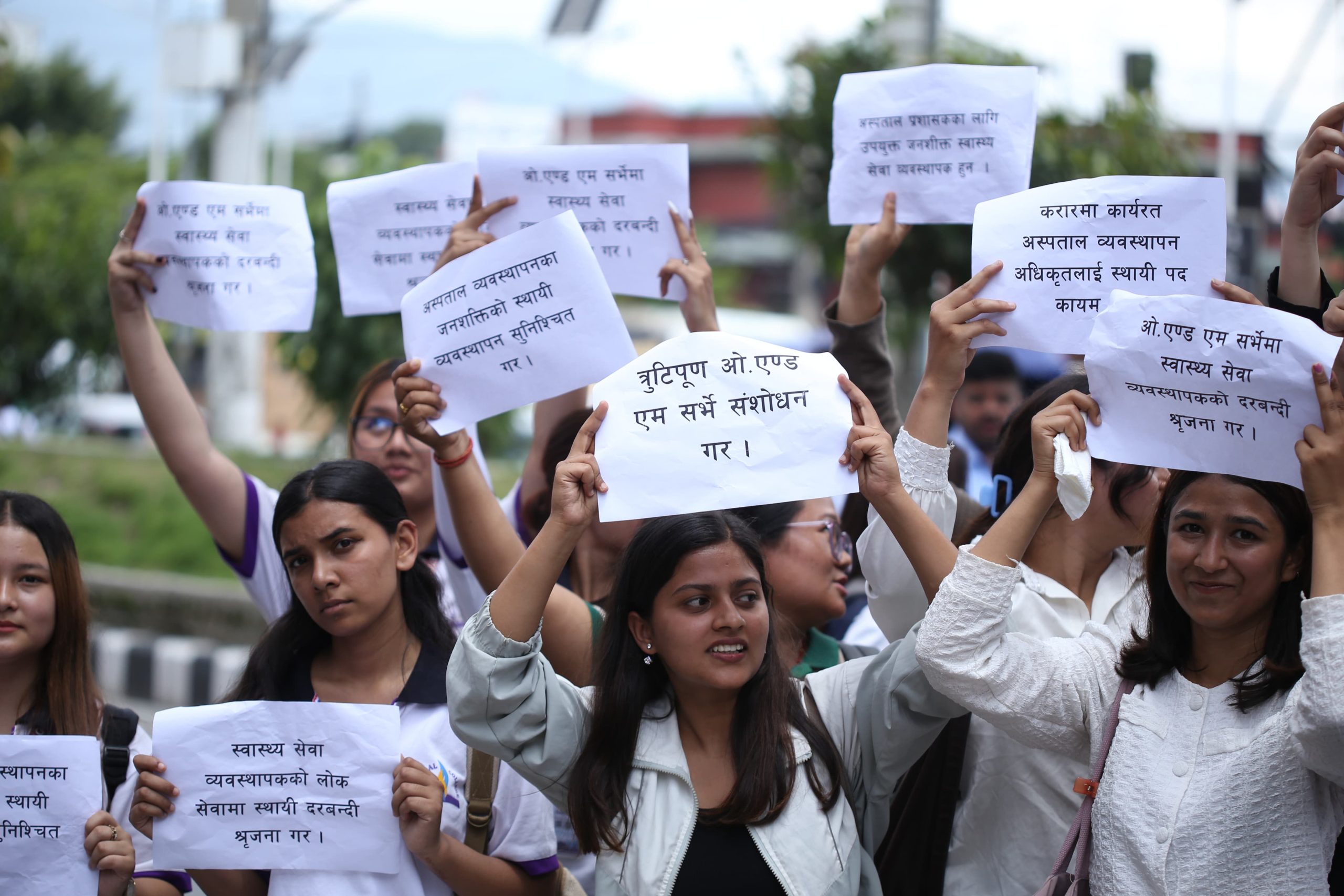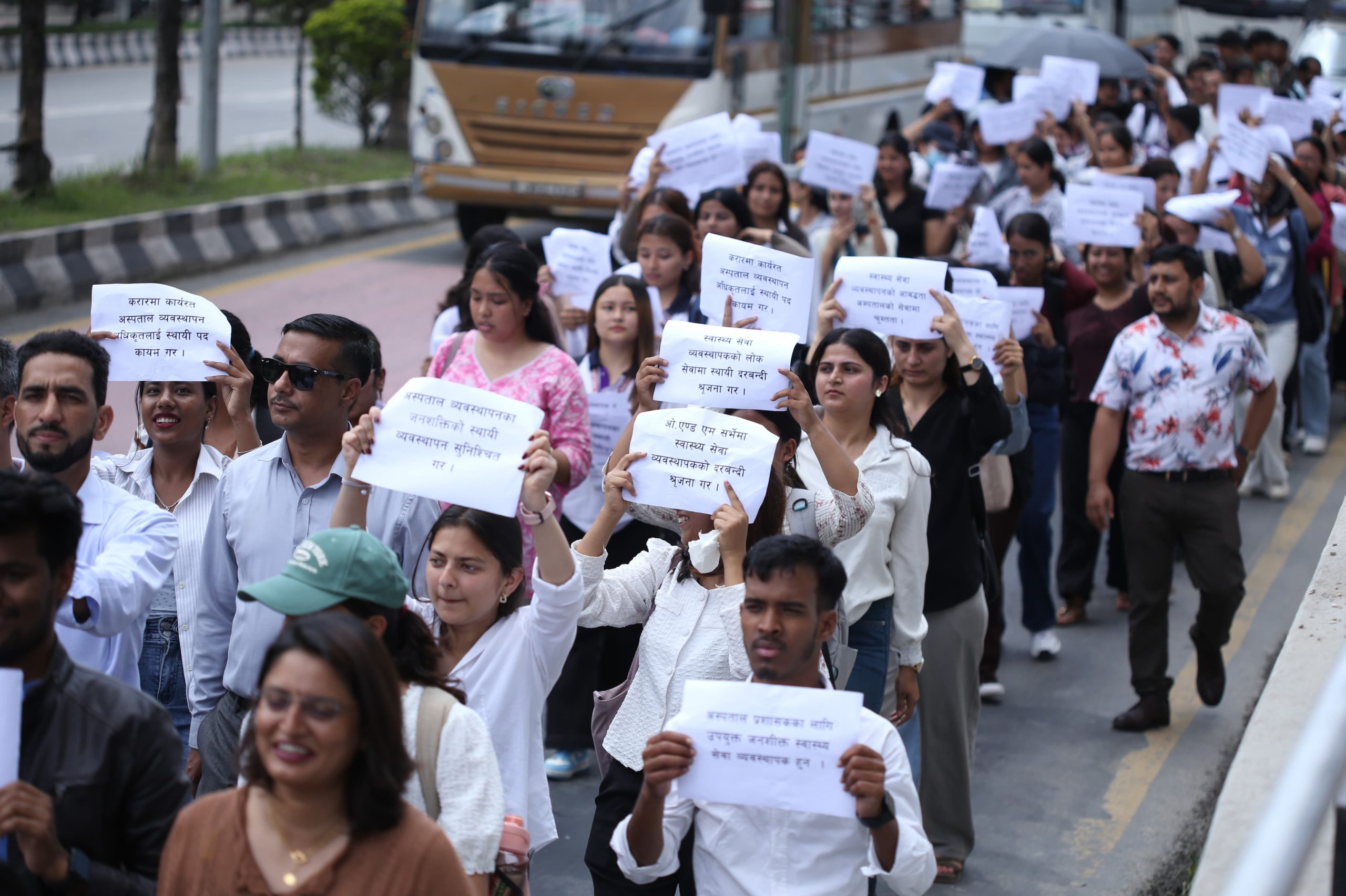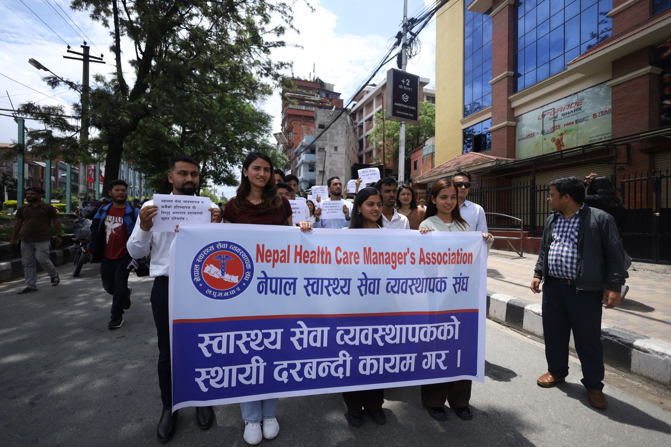 The participants carried banners and placards with slogans, marching from Bijulibazar to Maitighar. According to the association, omitting this position, which is considered essential for ensuring quality in the health service sector, contradicts the constitutional right to quality healthcare guaranteed as a fundamental right.