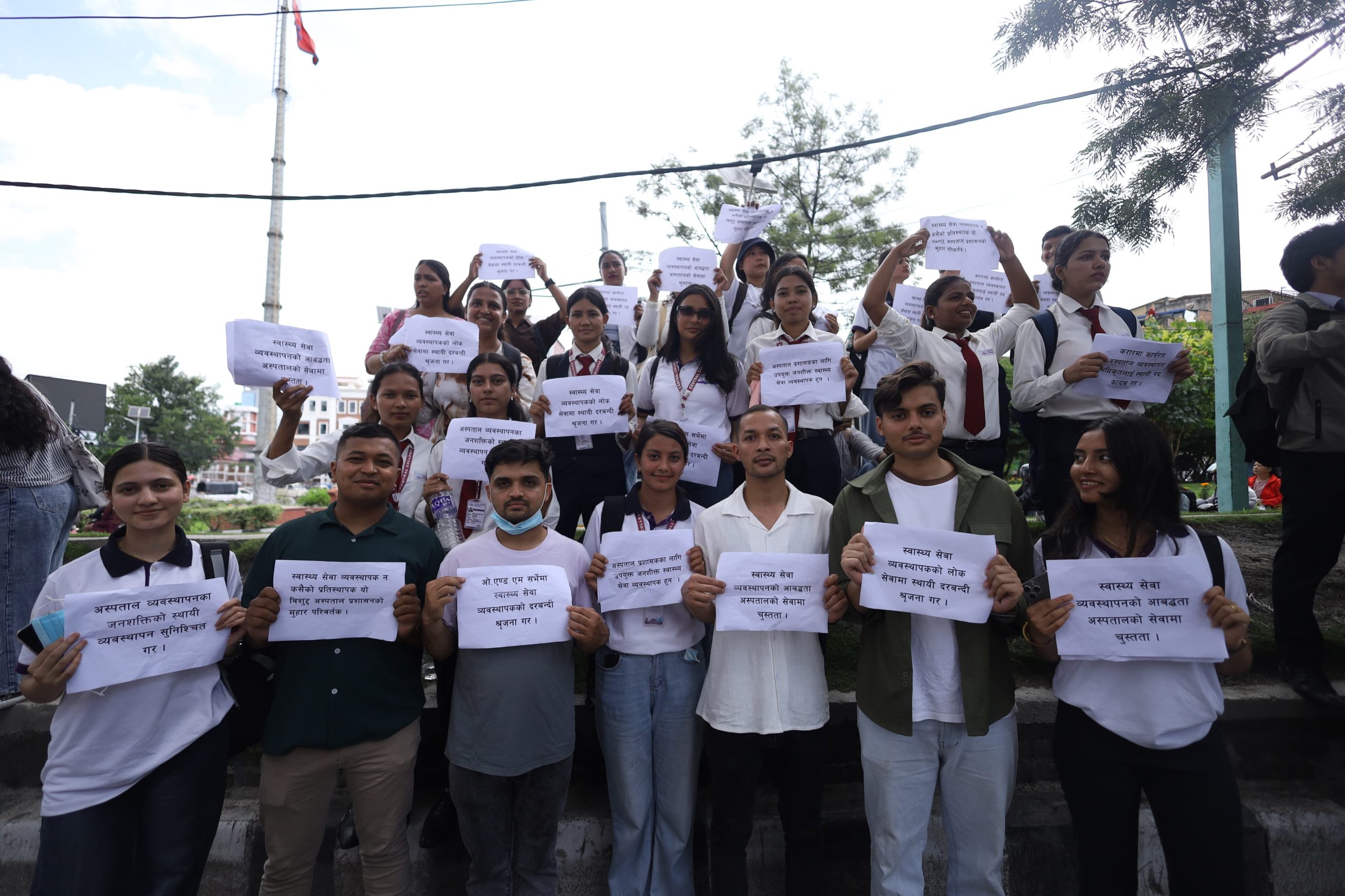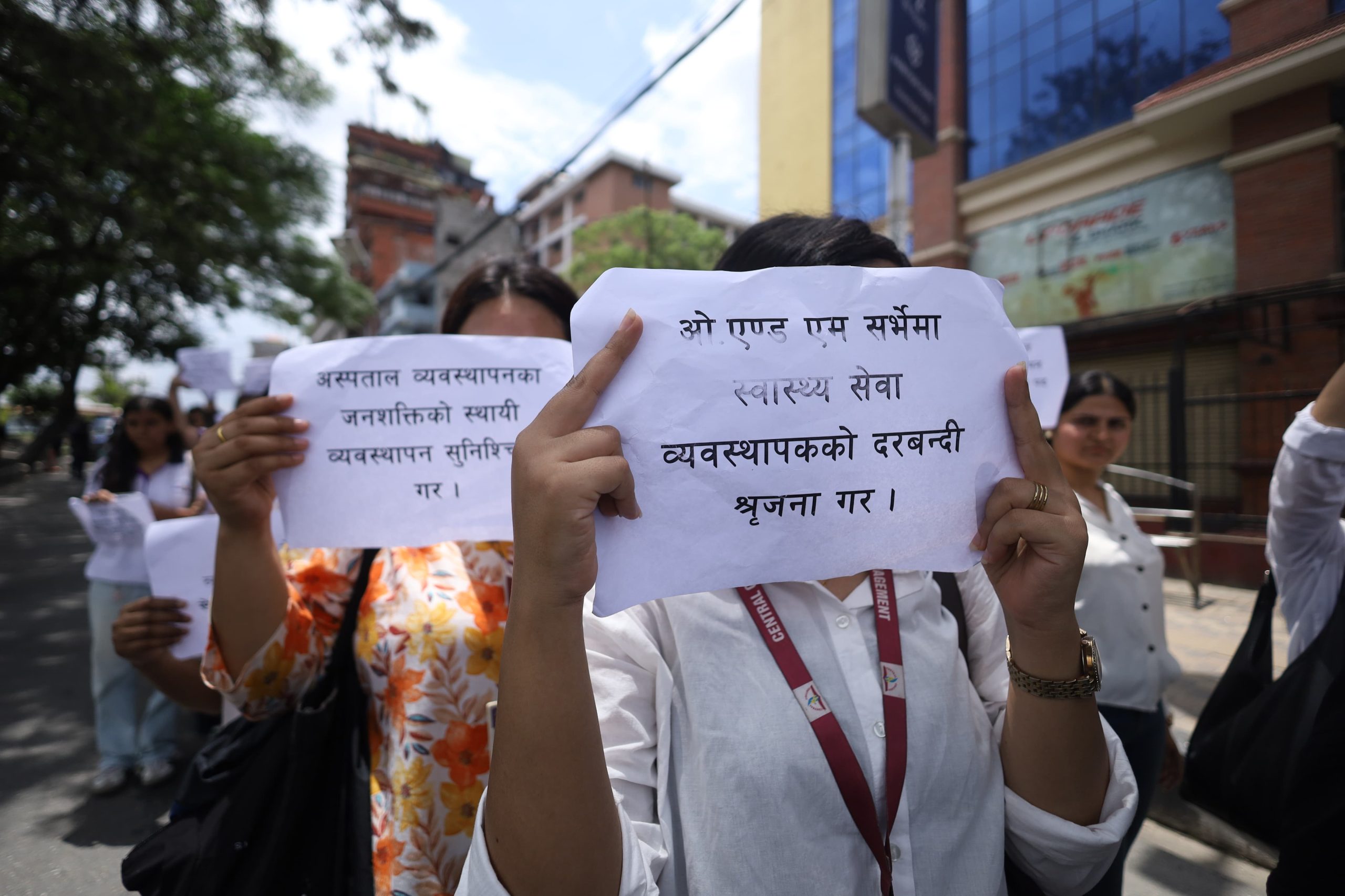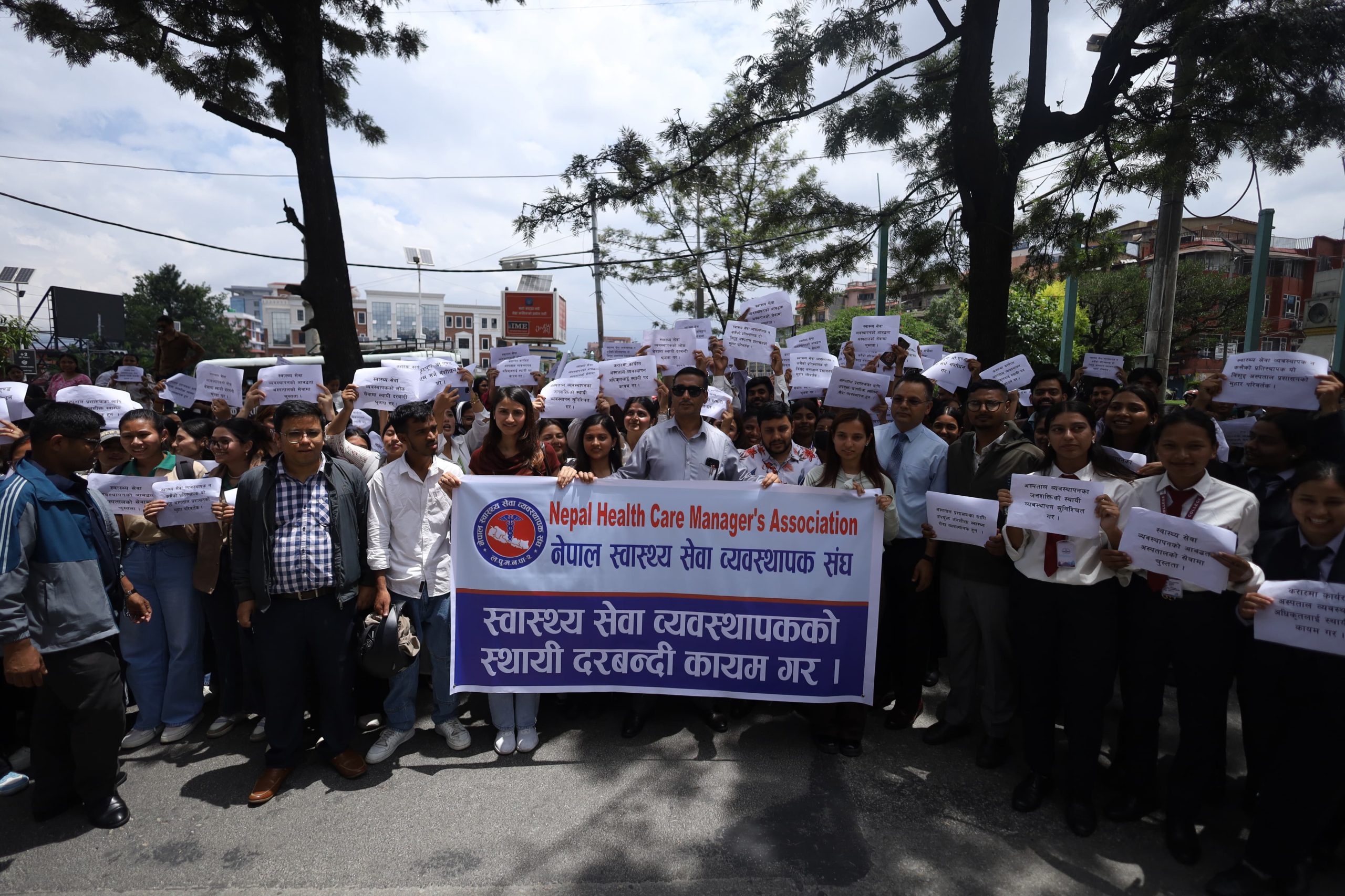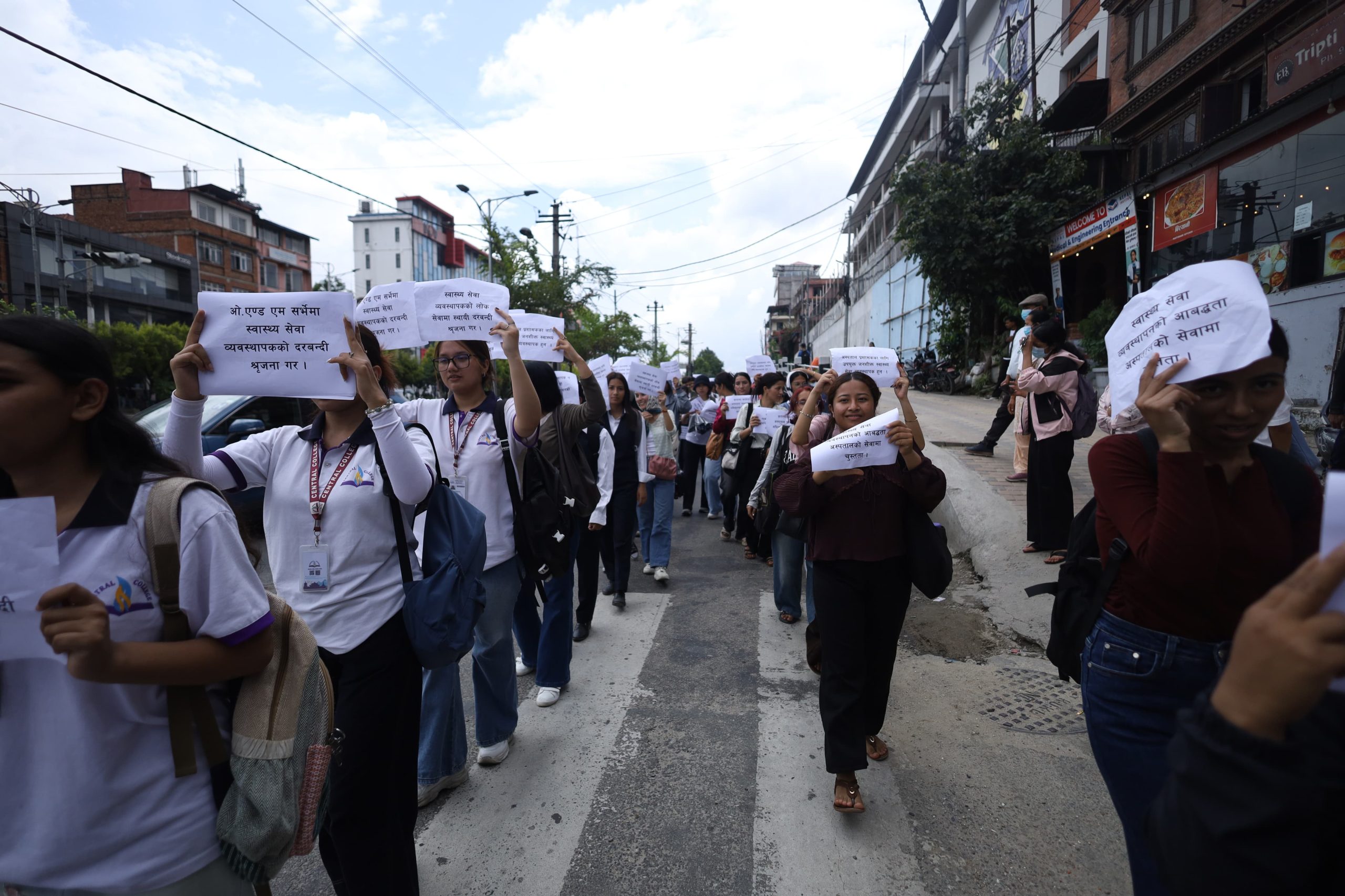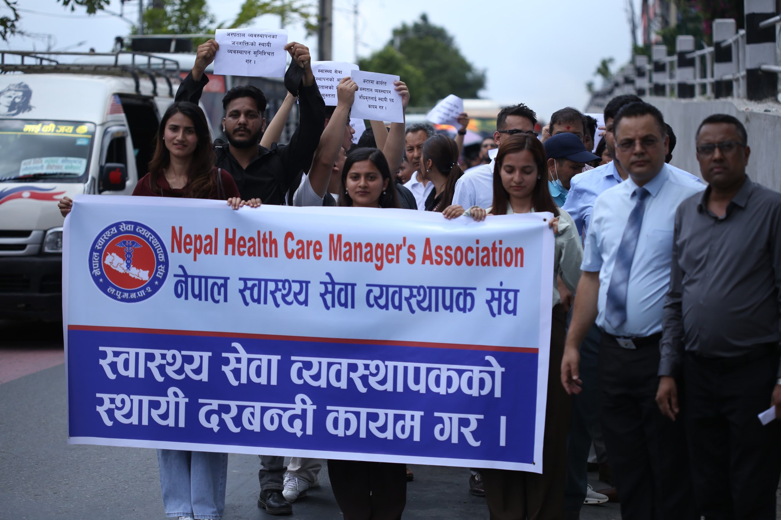 The participants carried banners and placards with slogans, marching from Bijulibazar to Maitighar. According to the association, omitting this position, which is considered essential for ensuring quality in the health service sector, contradicts the constitutional right to quality healthcare guaranteed as a fundamental right.