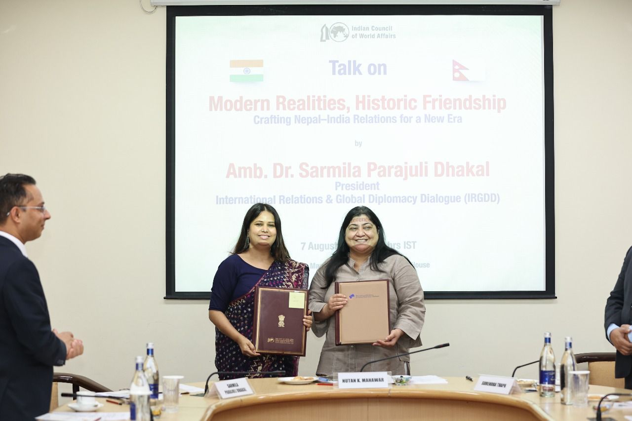Ambassador Dr. Sarmila Parajuli Dhakal, President of IRGDD, and Ambassador Nutan Kapoor Mahawar, Acting Director General and Additional Secretary at ICWA, signed the MoU during a formal ceremony at Sapru House, organized by ICWA.