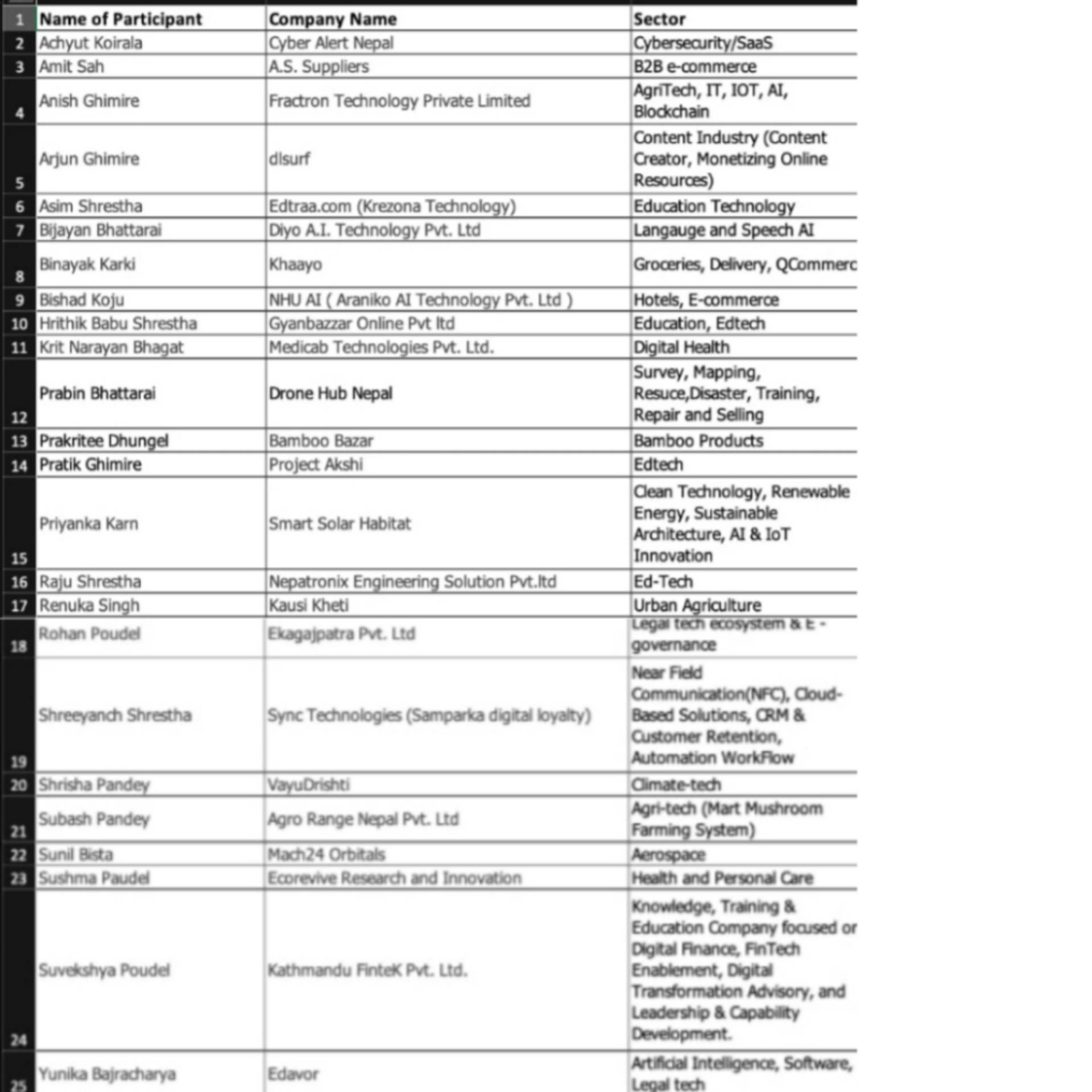 The 24 participants of IN-SPAN were selected through a competitive process out of around 250 applications from all over Nepal. The first cohort was chosen based on written applications, presentations by candidates, and an interview by the selection committee led by IIT Madras Pravartak. The participants of the first cohort were drawn from a diverse range of sectors, including cybersecurity, e-commerce, content creation platforms, AI, quick commerce, edtech, healthcare, drone technology, cleantech, agritech, legal tech, climate tech, aerospace, and fintech.