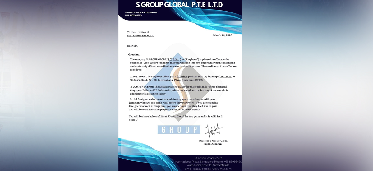 Victims claimed that Sujan had collected between 5 lakhs to 20 lakh rupees from each person, in 2079 B.S. in the name of arranging a job with a monthly salary between 3 thousand Singapore dollars (2 lakhs 93 thousand rupees) and 48 hundred Singapore dollars (4 lakhs 70 thousand rupees).