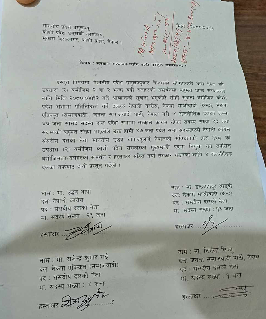 Biratnagar: Member of Parliament Uddhav Thapa has presented his claim for Chief Minister in the Koshi Province.