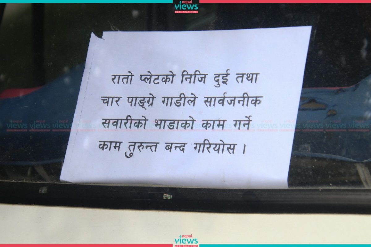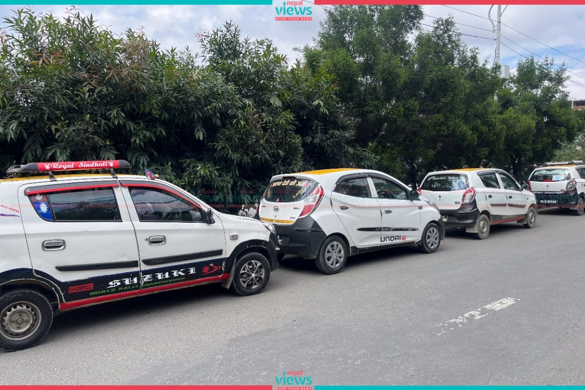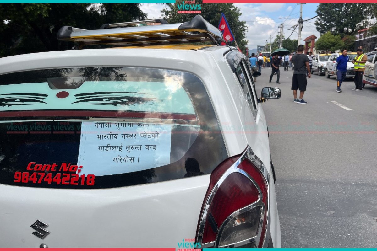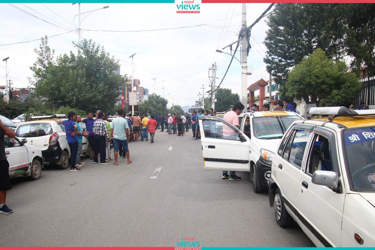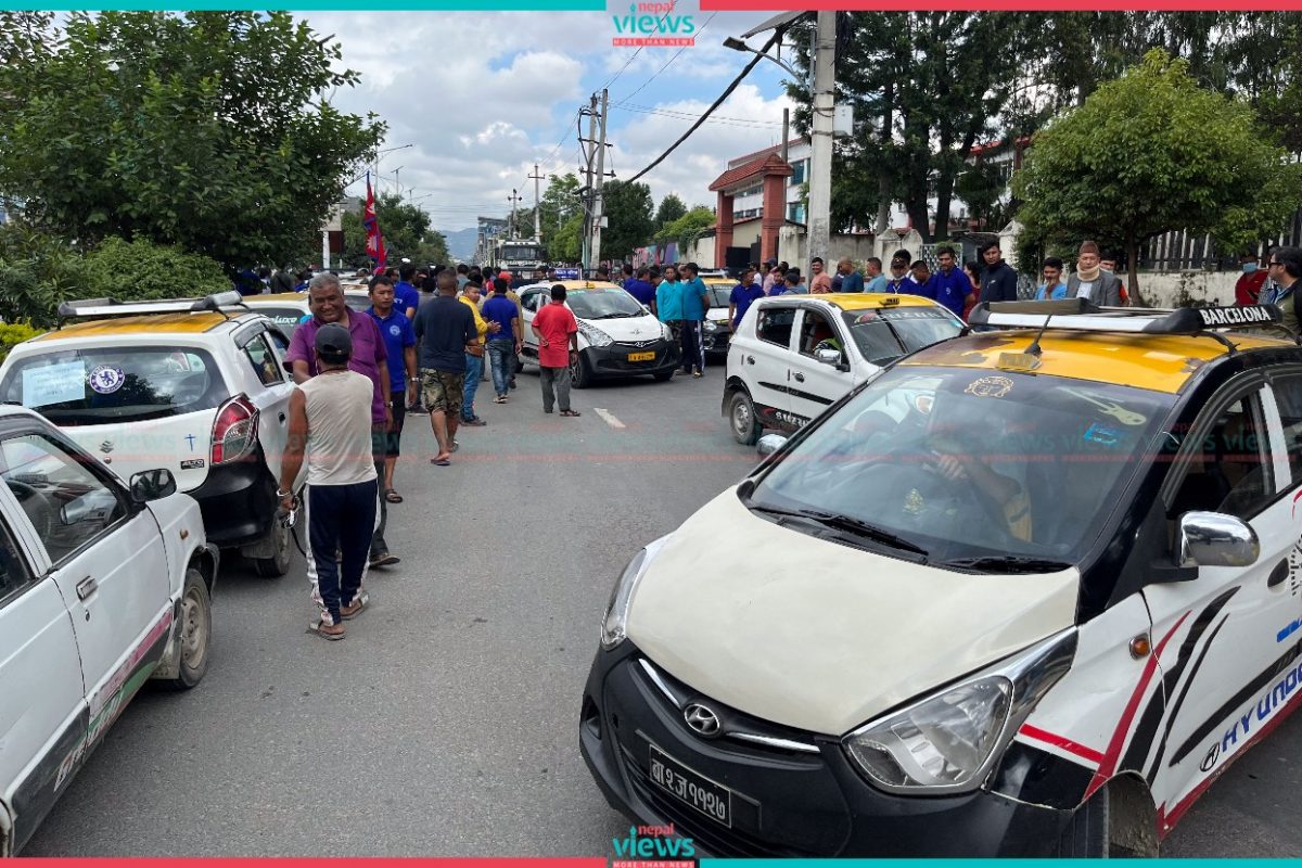 More than 50 taxis blocked the road and placed various demands. They protested along with several agendas. Stopping vehicles with red number plates to collect fares and restricting vehicles with Indian number plates on Nepali roads are some of their demands.